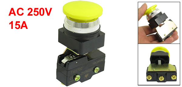 Product Name Micro Switch Model No. TM1702 Actuator Action Momentary Yellow Mushroom Head Push Button Contact Type 1 NO 1 NC 1 Com Ui / Ith AC 250V 15A AC-15 Ue: 240V Ie: 10A