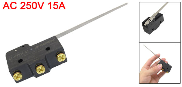 Product Name Micro Switch Model No. RZ-15HW24-B3 Actuator Type Long Hinge Lever Action Type Momentary Contact Type 1 NO 1 NC 1 Com(SPDT) Terminal Type Screw Terminals 1/4HP AC 250V 1/8HP AC 125V 1/2A DC 125V 1/4A DC 250V Power AC 250V 10A Actuator Length 10cm/ 3.9" Fix Hole Diameter 0.4cm/ 0.15" Fix Hole Distance 25mm/ 0.98"(Center to Center) Main Body Size 5 x 1.8 x 2.4cm/ 2.8" x 0.7" x 1.9"(L*W*H) Overall Length 13cm/ 5.1" Material Metal, Plastic Color As Picture Show Net Weight 36g Package Content 1 x Micro Switch - Reviews