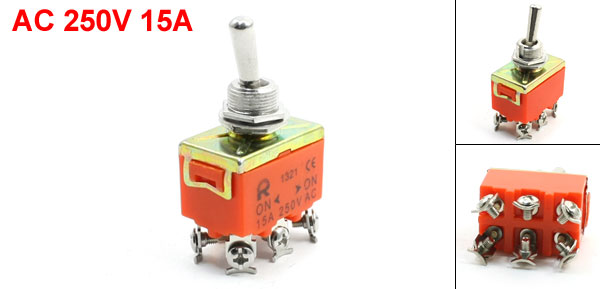 DetailsAC 250V 15A 6 Pin DPDT On-On Dual Position Latching Mini Toggle Switch  Product Name Toggle Switch Rating AC 250V 15A Pin Number 6 Pins Position 2 (On/On) Type DPDT Screw Diameter 3mm Total Size(Approx.) 3 x 2 x 5.5m / 1.2" x 0.8" x 2.2"(L*W*H) Material Plastic, Metal Color Orange, Silver Tone Weight 20g Package Content 1 x Toggle Switch