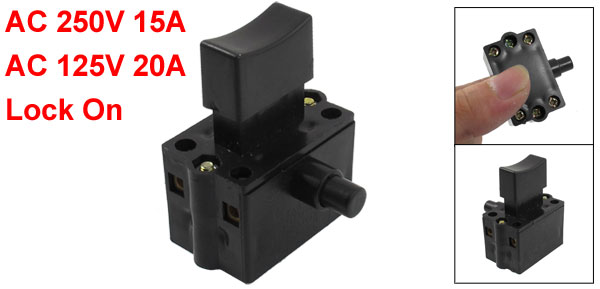 Product Name Trigger Switch Model No. FA4-15/2W Contact Type DPST, NO Action Type Lock On Rating AC 250V 15A, AC 125V 20A Button Size 1.9 x 0.6cm/ 0.75" x 0.24"(L*W) Size 3.6 x 3.4 x 4.5cm/ 1.42" x 1.34" x 1.77" (L*W*H) Material Plastic, Matel Color Black Weight 35g Package 1 x Trigger Switch - Reviews