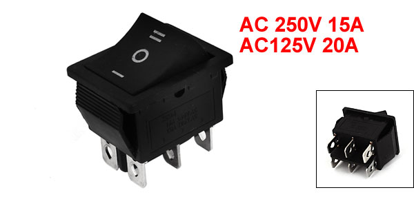 Main Color Black Product Name Rocker Switch Net Weight 13g Terminals Number 6 Overall Size 31 x 25 x 32mm/1.2" x 1" x 1.3"(L*W*H) Country of Manufacture CHINA Package Content 1 x Rocker Switch Mounting Size 30 x 23mm/0.2" x 0.9"(L*W) Voltage/Current AC 250V 15A, AC125V 20A Material Plastic, Metal Connection Type DPDT Position On-Off-On - Reviews