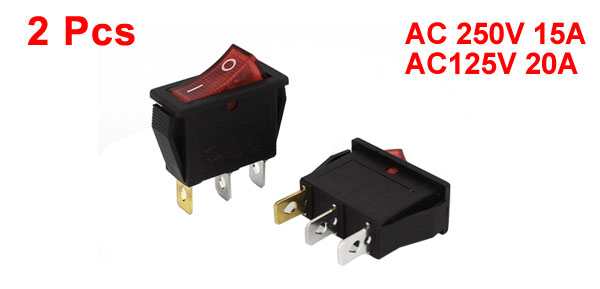 DetailsAC 250V 15A AC125V 20A DPST 3 Pin Terminal ON/OFF Snap In Boat Rocker Switch x 2  Product Name Rocker Switch Main Color Black, Red Net Weight 14g Terminals Number 3 Overall Size 31 x 14 x 36mm/1.2" x 0.55" x 1.4"(L*W*H) Country of Manufacture CHINA Package Content 2 x Rocker Switch Mounting Size 29 x 10mm/1.1" x 0.4" Voltage/Current AC 250V 15A, AC125V 20A Material Plastic, Metal Connection Type DPST Position On-Off