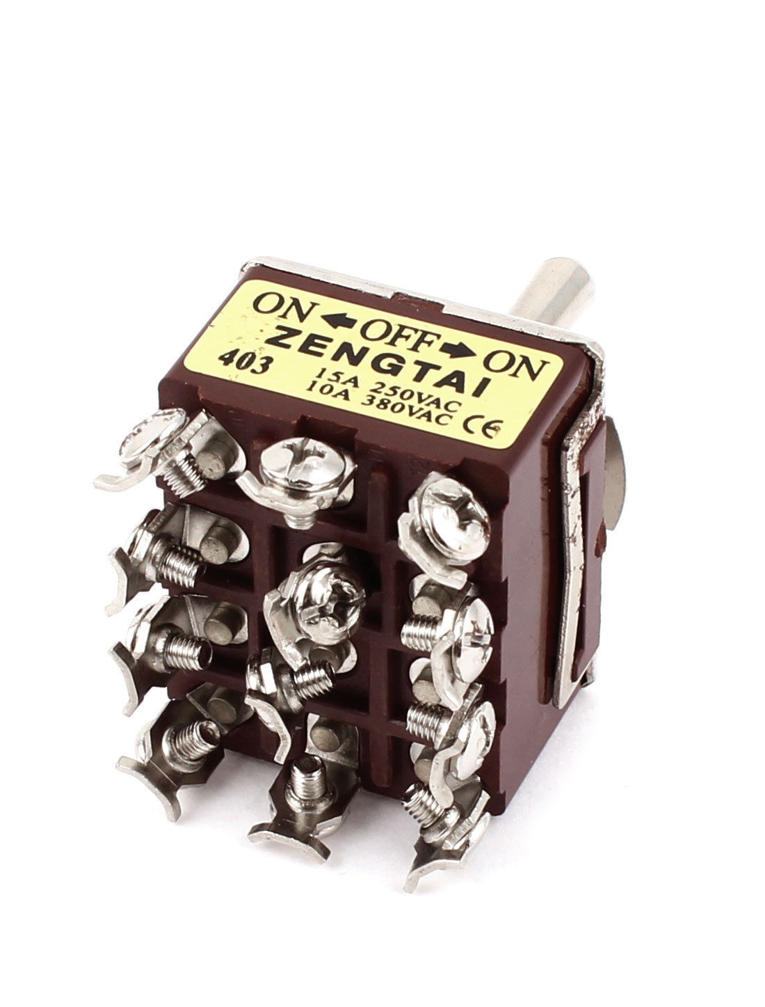 Main Color Brown Product Name Toggle Switch Net Weight 63g Country of Manufacture CHINA Package Content 1 x Toggle Switch Voltage/Current AC 250V 15A, AC 380V 10A Type 4P2T Material Plastic,Metal Position 3 Position (On-Off-On) Dimension 39 x 31 x 60mm/1.5" x 1.2" x 2.4"(L*W*H) Pin Number 12 Pins - Reviews