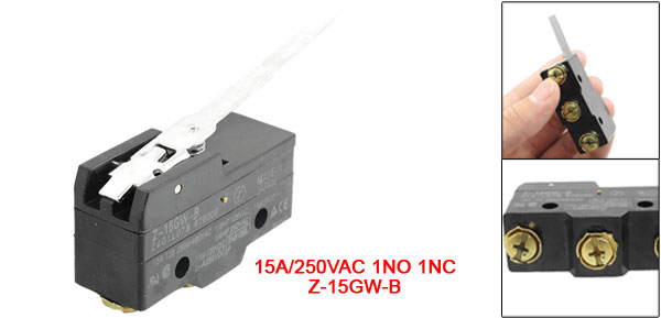 Product Name Micro Switch Model No. Z-15GW-B Actuator Type Long Hinge Lever Actuator Action Momentary Contact Type 1 NO, 1 NC, 1 Com Terminal Type Screw Terminals Ui / Ith AC 250V 15A Rated 1/8HP 125VAC / 1/4HP 250VAC