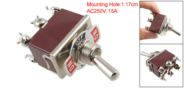 Product Name Toggle Switch Material Metal & Plastic Type DPDT(Latching) Position 3 Position(On/Off/On) Power AC 250V, 15A Mounting Hole ~1.17cm / 0.46" Size ~3 x 2 x 5.5cm / 1.2 x 0.79 x 2.2"(L*W*H) Color Red & Silver Tone Weight 38g Package Content 1 x ON/Off/ON Toggle Switch - Reviews