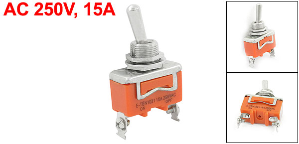 DetailsAC 250V 15A ON/OFF SPST 2 Way 2 Screw Terminals Toggle Switch  Product Name Toggle Switch Rated Voltage & Current AC 250V, 15A Position 2 Positions(ON/OFF) Type SPST(Latching) Body Size(Approx.) 29 x 16 x 18mm / 1.1" x 0.63" x 0.7"(L*W*T) Total Height 58mm / 2.3" Color Orange Material Metal, Resin, Rubber Weight 30g Package Content 1 x Toggle Switch