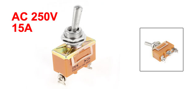 DetailsAC 250V 15A On/On 2 Position DPDT Toggle Switch Orange Replacement  Product Name Toggle Switch Rated Voltage/Current AC 250V 15A Action Type 2 Positions (ON/ON), 1NO 1NC Contact Type DPDT Thread Diameter 3mm/ 0.12" Body Size (Approx.) 30 x 19 x 15mm/ 0.12" x 0.75" x 0.6" (L*W*H) Material Plastic, Metal Color Orange, Silver Tone Weight 23g Package Content 1 x Toggle Switch