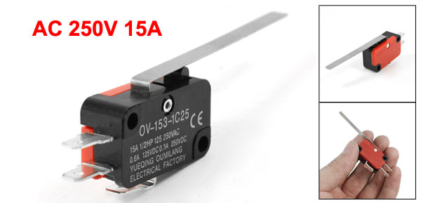 Product Name Micro Switch Model OV-153-1C25 Contact Type SPDT (Single Pole Double Throw) Actuator Type Push Button Power 15A, 250V AC Switch Body Size(Each) 28 x16 x 10mm / 1.1" x 0.6" x 0.4" (L* W * T) Fixing Holes Diameter 3.4mm / 0.13" Arm Size 50 x 8mm / 2" x 0.31" (L * W ) Material Plastic, Metal Switch Color Black, Red Net Weight 8g Package Content 1 x Micro Switch - Reviews