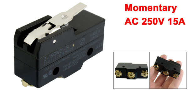 Product Name Micro Switch Model No. Z-15GW21-B Actuator Type Short Hinge Lever Actuator Action Momentary Contact Type 1 NO, 1 NC, 1 Com Terminal Type Screw Terminals Ui / Ith AC 250V 15A Rated 1/8HP 125VAC / 1/4HP 250VAC