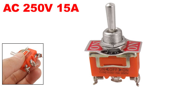 Product Name Toggle Switch Rating AC 250V 15A Pins Number 3 Terminals Position 3 Type SPST (ON/Off/ON) Mounting Hole 11.5mm Total Size(Approx.) 2.9 x 1.5 x 5.2cm/ 1.1" x 0.6" x 2" (L*W*T) Material Plastic & Metal Color Orange & Silver Tone Weight 23g Package Content 1 x Toggle Switch - Reviews