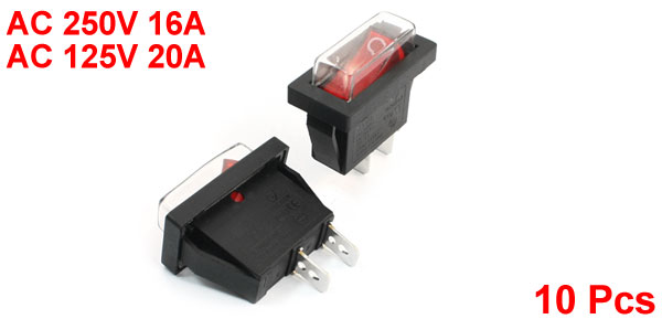 AC 250V/16A 125V/20A 2-Pin SPST I/O Red Light Waterproof Rocker Switch 10PCS