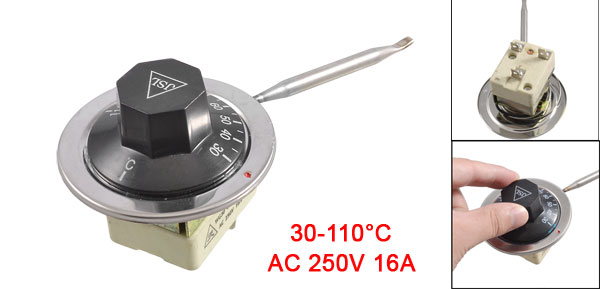 DetailsAC 250V 16A 30-110 Celsius 3 Terminals Pin Thermostat Temperature Controller  Product Name Temperature Control Switch Material Plastic, Resin, Metal Contact 1 NO 1NC Control Temerature 30-110°C Rating AC 250V 16A Connect Method 3 pin connect to power electro circuit Knob Color Black Probe Diameter 6mm / 0.23" Probe Length 70mm / 2.7" Pin Size 10 x 6.5mm / 0.39" x 0.25" (L * W) Base Dimension 43 x 34 x 22mm / 1.7" x 1.3" x 0.86" (L * W * H) Overall Dimension 68 x 60mm / 2.6" x 2.3" (Max.D * H) Weight 113g Package Content 1 x Temperature Control Switch