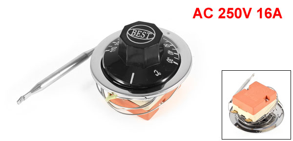 Product Name Temperature Capillary Thermostat Material Plastic, Resin, Metal Contact NC(Normal Closed) Control Temerature 30-110°C Rating AC 250V 16A Connect Method two pin connect to power electro circuit Knob Color Black Probe Diameter 6mm / 0.23" Probe Length 73mm / 2.9" Capillary Length(Approx.) 72cm / 28.3" Pin Size 9 x 6.5mm / 0.35" x 0.25" (L*W) Base Dimension 43 x 34 x 23mm / 1.7" x 1.3" x 0.9" (L*W*H) Overall Dimension 68 x 53mm / 2.6" x 2.1" (Max.D*H) Weight 96g Package Content 1 x Temperature Capillary Switch - Reviews