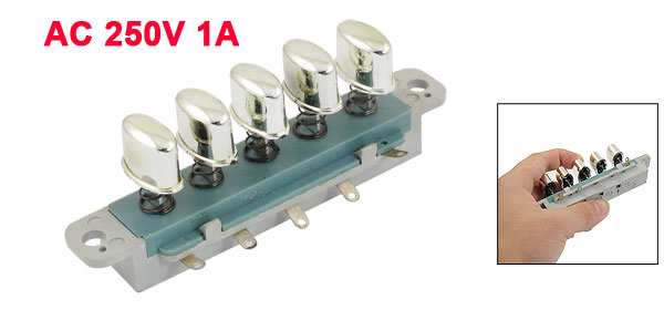 Product Name Pushbutton Switch Button Number 5 Voltage/ Current AC 250V 1A Overall Size 11 x 2.7 x 4cm/ 4.3" x 1" x 1.57" (L*W*T) Mount Hole Dia. 6mm/ 0.24" Mount Hole Distance 10cm/ 3.94"(Center to Center) Material Plastic, Electronic Part Base Color Gray, Green Cap Color Silver Tone Net Weight 34g Package Content 1 x Pushbutton Switch - Reviews