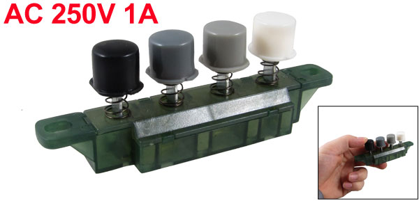 Product Name Piano Key Switch Button Number 4 Voltage/ Current AC 250V 1A Overall Size 10.3 x 1.8 x 3.7cm/ 4" x 0.73" x 1.5" (L*W*H) Screw Hole Size(Each) 6.8 x 5mm/ 0.27" x 0.2"(L*W) Material Plastic, Electronic Part Main Color Green, White, Black, Gray Net Weight 23g Package Content 1 x 4 Press Button Piano Key Switch - Reviews
