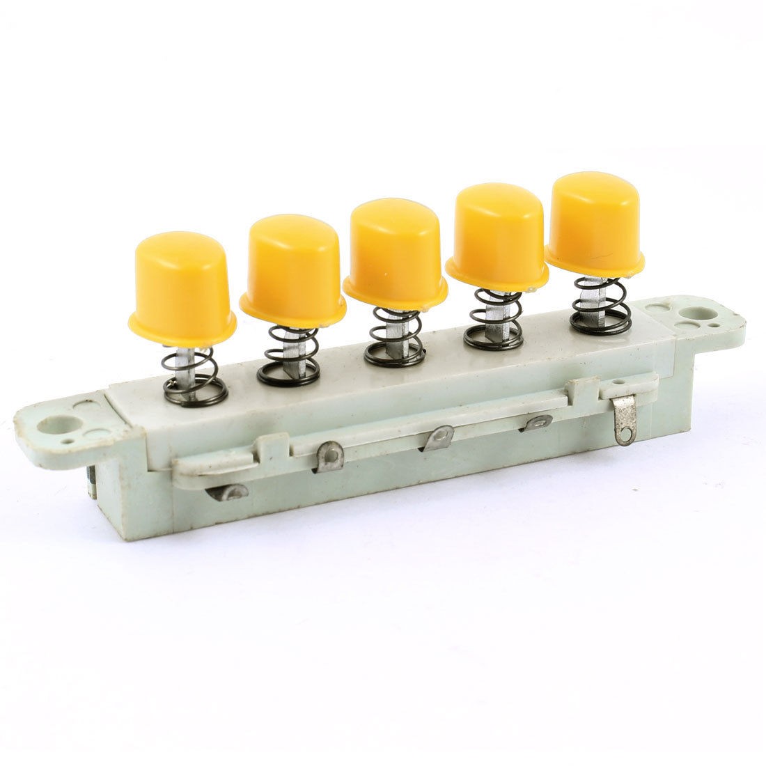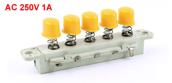 Product Name Push Button Switch Button Number 5 Voltage/ Current AC 250V 1A Overall Size 11 x 2.7 x 3.8cm/ 4.3" x 1" x 1.5" (L*W*T) Mount Hole Dia. 6mm/ 0.24" Material Plastic, Electronic Part Cap Color Yellow Net Weight 34g Package Content 1 x Push Button Switch - Reviews