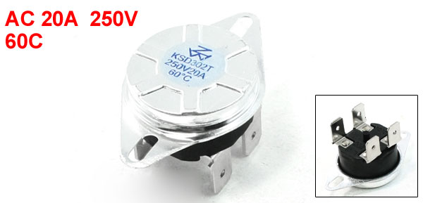 Product Name Thermostat Model.No KSD302T Action Type NC Action Temperature 60C Voltage 20A AC 250V Size(Each) 4.5 x 2.8 x 2.3cm/1.8" x 1.1" x 0.9"(L*W*T) Material Metal, Plastic Color Black, Silver Tone Net Weight 14g Package Content 1 x Thermostat - Reviews