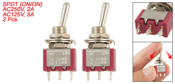 Product Name Toggle Switch Material Metal & Plastic Type SPDT (ON/ON) Thead Dia(Approx) 0.56cm / 0.220" Power AC250V, 2A AC125V, 5A Overall Size(Approx) 1.3 x 1.2 x 3.2cm / 0.5" x 0.4" x 1.3"(L*W*H) Color Red & Silver Tone Weight 11g Package Content 2 Pcs x ON/ON Toggle Switch - Reviews