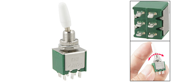 Product Name Toggle Switch Rating AC 250V 2A Pin Number 6 Pins Position 2 Position(On/On) Type DPDT(Latching) Screw Diameter 6mm Total Size(Approx.) 3.5 x 1.2 x 0.7cm / 1.4" x 0.5" x 0.3"(L*W*T) Material Plastic & Metal Color Green & Silver Tone Weight 10g Package Content 1 x Toggle Switch - Reviews