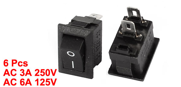 Product Name Rocker Switch Action SPST Terminals 2 Pin (ON-OFF) Rating Voltage 3A 250VAC 6A 125VAC Total Size 1.5 x 1 x 1.8cm/0.6" x 0.4" x 0.7"(L* W *T) Mounting Dimension 1.3 x 0.8cm/0.51" x 0.31"(L*W) Color Black, Silver Tone Material Plastic & Metal Total Weight 10g Package Content 6 x Rocker Switch - Reviews