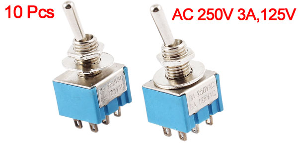 Product Name Toggle Switch Model No. MTS-2 Rated Voltage & Current AC 250V 3A,125V 6A Pin Number 6 Pins Position 2 Positions(ON/OFF) Type DPST(Latching) Mounting Hole Diameter 5.8mm / 0.23" Body Size(Approx.) 13 x 13 x 9.7mm / 0.5" x 0.5" x 0.38"(L*W*T) Total Height 33mm / 1.3" Material Plastic, Metal Weight 60g Package Content 10 Pcs x Toggle Switchs - Reviews