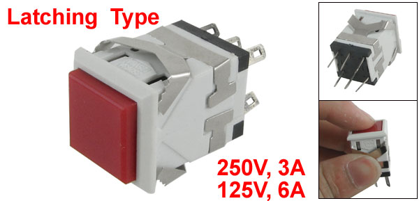Product Name Push Button Switch Operation Type Latching Contact 2NO+2NC Switch Rating 250V/3A, 6A/125V Pin Number 6 Mounting Size 16 x 16mm/0.6'' x 0.6'' (L*W) Total Size 19 x 19 x 34mm/0.7'' x 0.7'' x 1.3'' (L*W*H) Material Plastic, Electric Parts Cap Color Red Net Weight 8g Package Content 1 x Latching Push Button Switch - Reviews