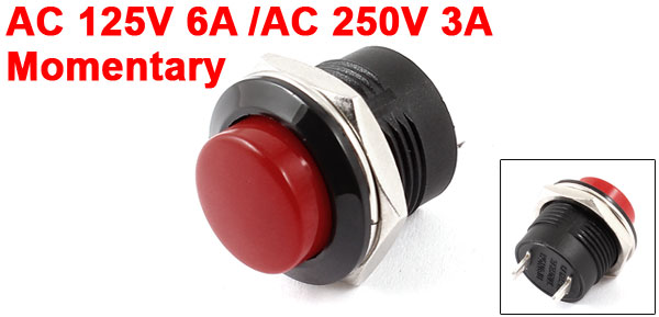 Item Name Push Button Switch Action Type Momentary Contact Type SPST(1NO) Voltage AC 125V 6A /AC 250V 3A Button Color Red Button Diameter 1.3cm / 0.5" Thread Diameter 15.5mm / 0.6" Pin Spacing 8mm / 0.3" Total Size 2.4 x 2.1cm / 0.94" x 0.83"(L*Max.D) Material Plastic, Metal Weight 6g Package Content 1 x Push Switch - Reviews
