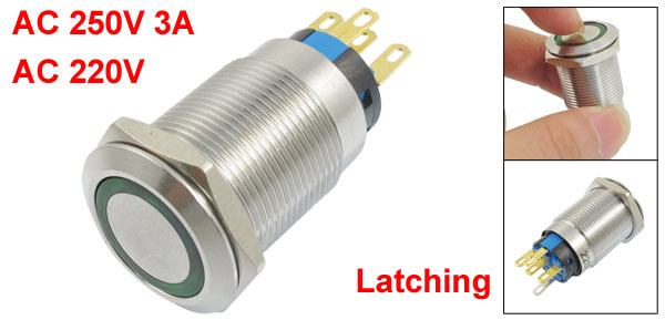 AC 250V 3A AC 220V Green Lamp Flat Latching Stainless Push Button Switch