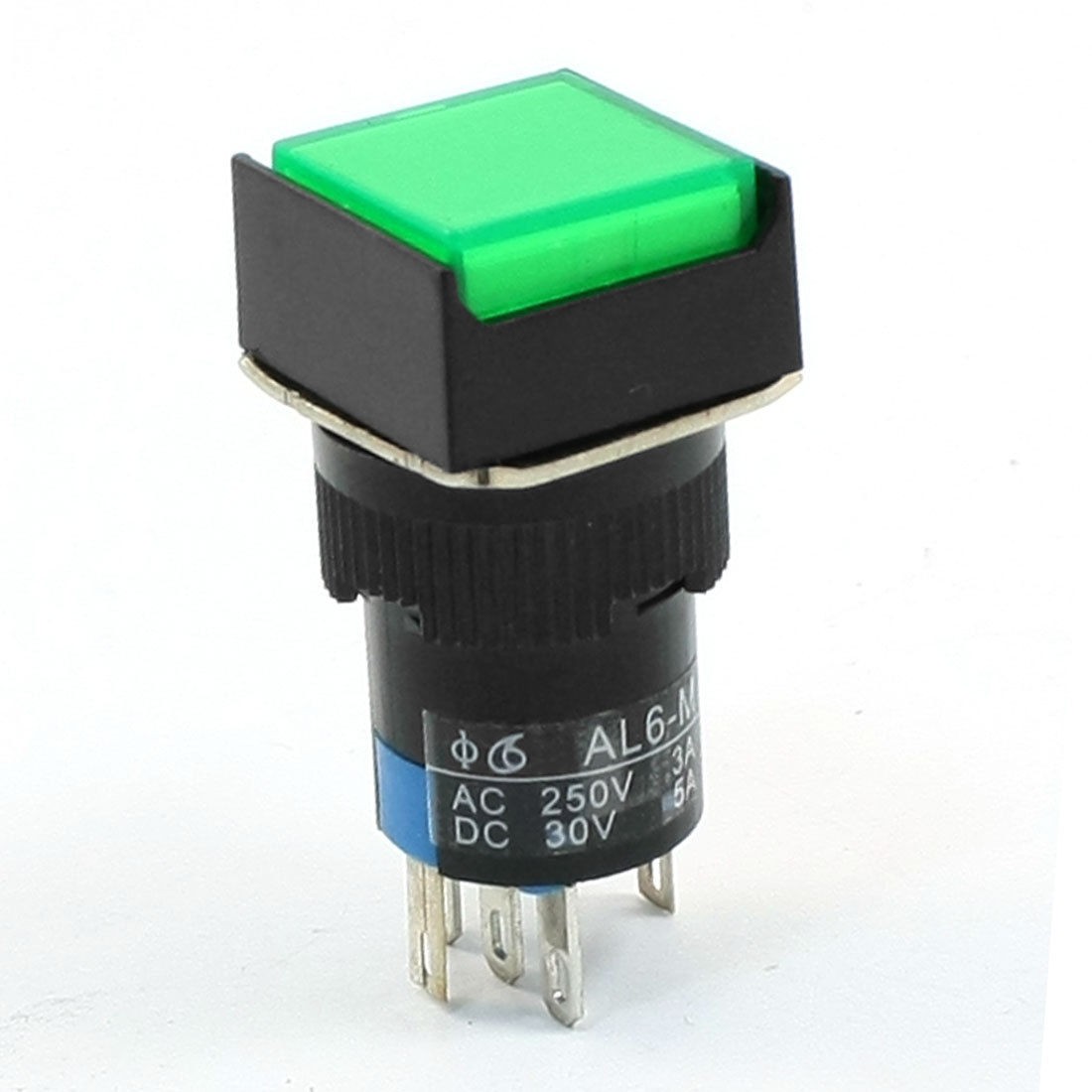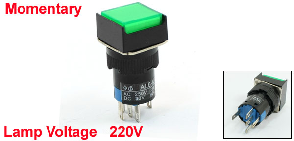 DetailsAC 250V/3A DC 30V/5A 1NO 1NC Momentary Green Pushbutton Switch 220V Lamp  Item Name Push Button Switch Contact Type 1NO, 1NC Switch Type Momentary Type Working Voltage AC 250V 3A, DC 30V 5A Lamp Voltage 220V Switch Color Black, Green Light Color Green Pin Number 5 Button Size 15 x 15mm/ 0.59" x 0.59" (L*W) Mounting Thread Dia. 15mm/ 0.59" Total Size 18 x 18 x 40mm/ 0.71" x 0.71" x 1.6"(L*W*H) Material Plastic, Electronic Parts Weight 9g Package Content 1 x Push Button Switch