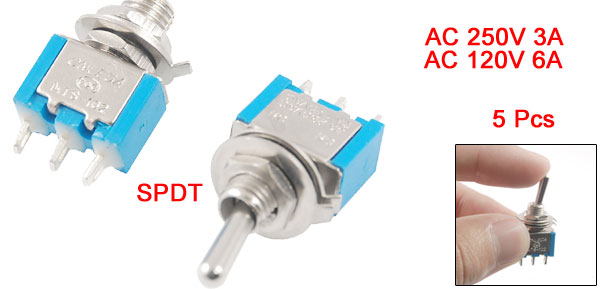 Switch Overall Size 13 x 7 x 32mm/ 0.5" x 0.3" x 1.3" (L*W*H) Knob Size 10 x 2 mm/ 0.4" x 0.07" (L*D) Mounting Hole Diameter 6mm / 0.236" Pin Size 3 x 2mm/ 0.11" x 0.07"(L*W) Pin Spacing 4.5mm/ 0.177" Material Plastic & Metal Color Blue, Silver Tone Net Weight 26g Package Content 5 x Toggle Switch - Reviews