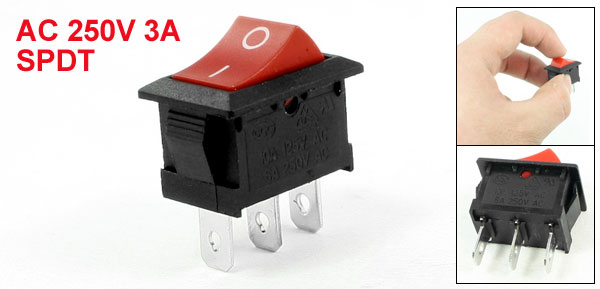 Product Name Rocker Switch Poles SPDT Terminals 3 Pins (I/O) Rating Voltage AC 250V 3A Total Size 21 x 15 x 26mcm/ 0.8" x 0.6" x 1"(L*W*T) Mounting Size 18 x 12m/ 0.7" x 0.5"(L*W) Color Black, Red Material Plastic, Metal Net Weight 3g Package Content 1 x Rocker Switch - Reviews