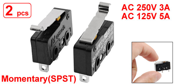 Type SPDT Contact Type 1NO + 1NC Action Type Momentary Terminal number 3 Overall Size 20 x 6 x 16mm/ 0.8" x 0.2" x 0.6" (L*W*H) Mounting Hole Dia. 2.2mm / 0.08" Pin Size 4 x 3mm/ 0.15" x 0.11"(L*W) Pin Pitch 7.4mm / 0.291" Lever Arm Size 19 x 4mm/ 0.7" x 0.2" (L*Max.W) Material Plastic, Metal Main Color Black Weight 6g Package Content 2 x Micro Switches - Reviews