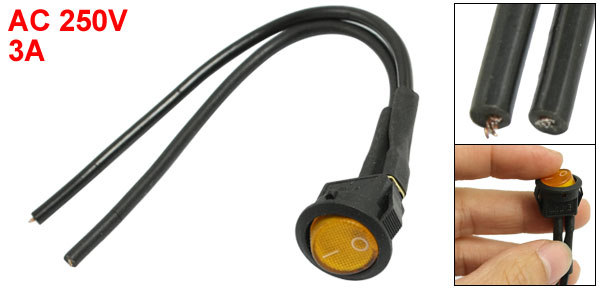 Product Name Rocker Switch Type KCD1-108 Connection Type SPST Position On-Off Terminals Number 2 Rating Voltage/Current 3A 250V AC Size 16 x 15mm/ 0.63" x 0.59"(D*H) Mounted Size 16 x 15mm/ 0.63" x 0.59"((L*W) Wire Length 12.5cm/ 4.9" Switch Color Black Light Color Yellow Material Plastic, Metal Weight 5g Package Content 1 x Rocker Switch - Reviews