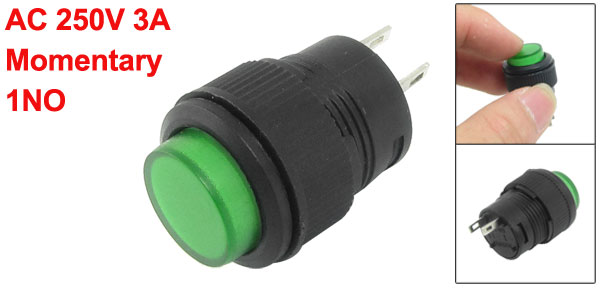 Item Name Push Button Switch Action Type Momentary Contact Type 1NO Voltage AC 250V Current 3A Terminals 2 Pins Button Diameter 13mm / 0.51" Mounting Hole Diameter 15.5mm / 0.61" Total Size 29 x 18mm / 1.1" x 0.71" (L*Dia.) Material Plastic, Electric Parts Color Green, Black Net Weight 6g Package Content 1 x Push Button Switch - Reviews