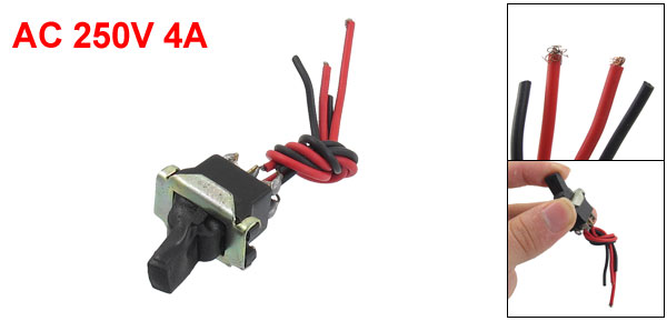 Product Name Toggle Switch Action Type Latching Number of Position 2(ON/OFF) Voltage/Current AC 250V 4A Cable Length 9cm/ 3.54" Size 2.4 x 1.5 x 3.4cm/ 0.94" x 0.59" x 1.34" (L*W*H) Material Plastic, Matel Color Black Weight 8g Package 1 x Toggle Switch - Reviews