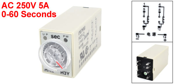 Product Name Timer Delay Relay Type H3Y-2 Contact Resistive Load AC 250V 5A Number of Terminals 8 Pins Time Range 0-60 Seconds Indicator Operation UP-PW Two LED Indicator Light External Material Plastic , Metal Mounted Size 2.8 x 2.1 x 5.2cm/1.1" x 0.8" x 2"(L*W*H) Total Size 28 x 21 x 64mm / 1.1" x 0.8" x 2.5"(L*W*H) Net Weight 39g Package Content 1x Timer Delay Relay