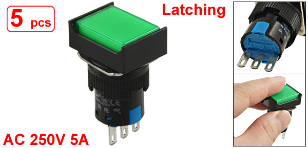 AC 250V 5A 1NO 1NC Latching Green Rectangular Push Button Switch 5 Pcs