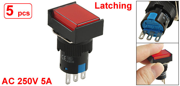 AC 250V 5A 1NO 1NC Latching Red Rectangular Push Button Switch 5 Pcs