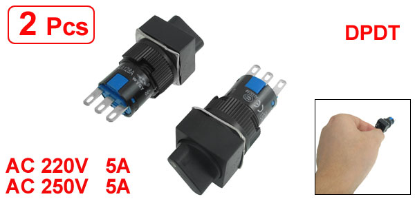 Item Name Push Button Switch Type Rotary Selector Type Selector Switch Mode 2 Position Contact Type DPDT, 1 NO, 1 NC Switch Working Voltage AC 250V 5A Thermal Current(Ith) AC 220V 5A Button Color Black Button Shape Square Button Size 17 x 17mm/ 0.67" x 0.67" (L*W) Mounting Thread Dia. 16mm/ 0.63" Size 17 x 17 x 45mm/ 0.67" x 0.67" x 1.8" (L*W*T) Material Plastic, Electronic Parts Net Weight 18g Package Content 2 x Selector Push Button Switch - Reviews