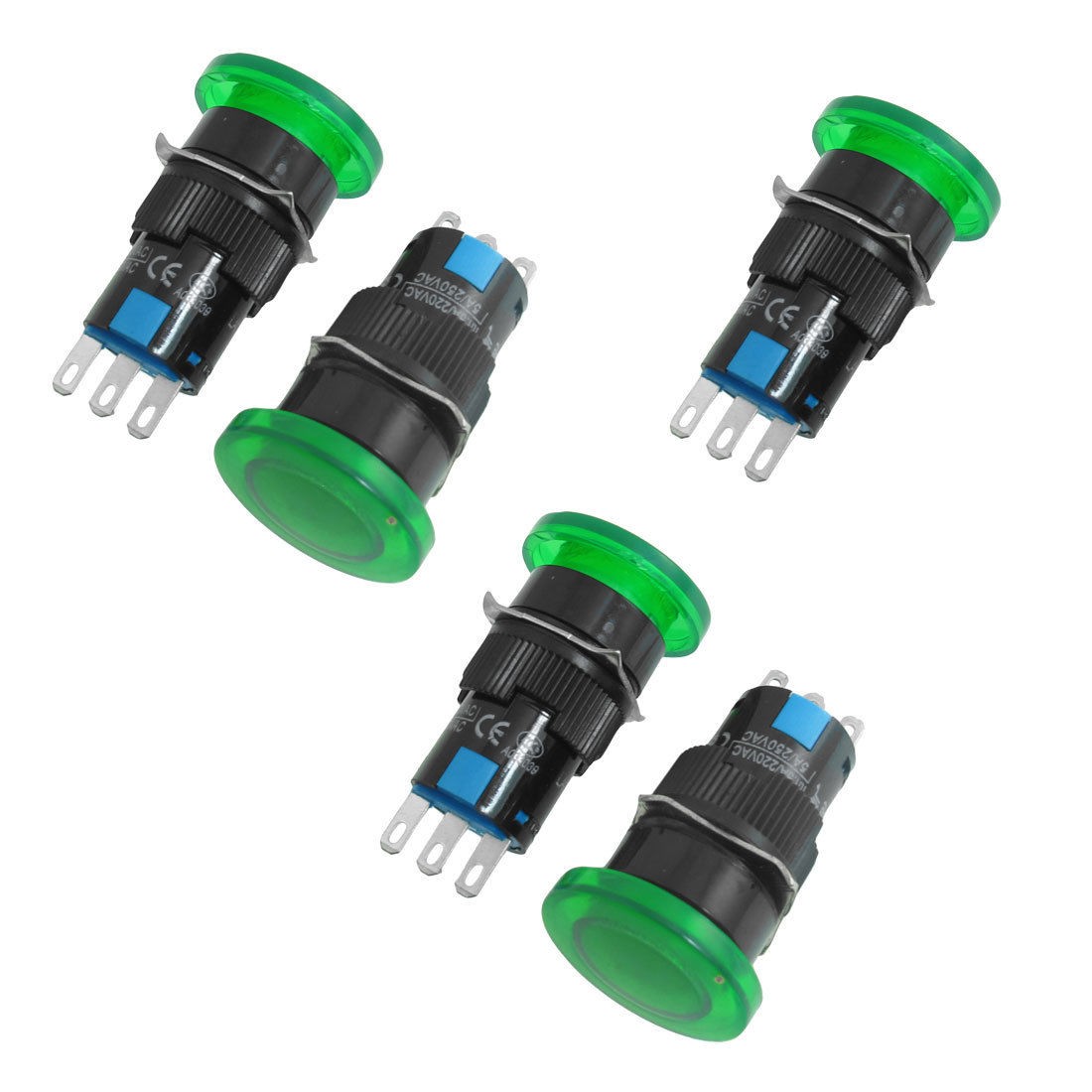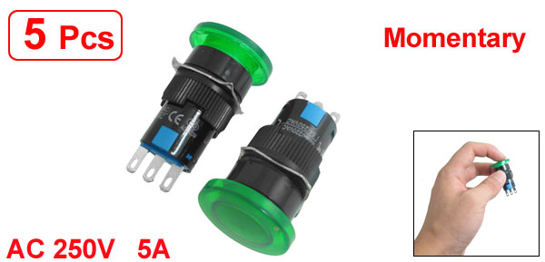 Product Name Push Button Switch Action Type Momentary Contact Type 1NO+1NC Voltage AC 250V Current 5A Terminals 3 Pins Button Diameter 23mm / 0.9" Mounting Hole Diameter 15.6mm / 0.61" Total Size 17 x 17 x 42mm / 0.7" x 0.7" x 1.7"(L*W*H) Color Green Material Plastic, Electric Parts Net Weight 35g Package Content 5 x Push Button Switch - Reviews