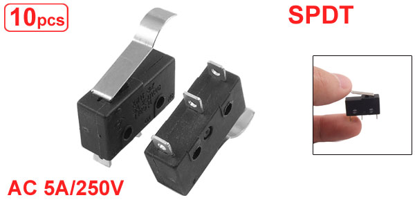 Product Name Micro Switch Voltage & Current AC 250V 5A Poles SPDT Contact Type 1NO + 1NC Action Type Momentary Actuator Type Hooked Lever Terminal Type 3-Pin Terminals Overall Size 20 x 6.5 x 13.5mm / 0.79" x 0.26" x 0.53" (L*W*H) Mounting Hole Dia. 2mm / 0.08" Mounting Hole Spacing 10mm / 0.39" Pin Pitch 7 x 9mm / 0.28" x 0.35" Lever Arm Size 20.5 x 4mm / 0.8" x 0.16" (L*W) Material Plastic, Metal Color Black, Silver Tone Total Weight 23g Package Content 10 x Micro Switches - Reviews