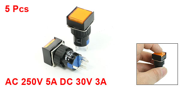 AC 250V 5A DC 30V 3A Latching Yellow Lamp Rectangular Pushbutton Switch 5 Pcs