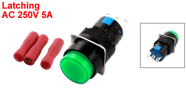 Item Name Push Button Switch w Crimp Connector Contact Type SPDT(1NO 1NC) Action Type Latching Pin Number 3 Voltage, Current AC 250V 5A Thread Dia 16mm/0.63" Total Size(Not Included Pin) 30 x 15mm /1.2" x 0.6" (L*D) Button Color Green Material Plastic, Metal Net Weight 10g Package Content 1 x Round Push Button Switch