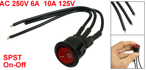 Product Name Rocker Switch Connection Type SPST Position On-Off Terminals Number 3 Rating Voltage/Current AC 250V 6A, 10A 125V Size 23 x 21mm/ 0.9" x 0.8"(D*H) Mounted Size 23 x 21mm/ 0.9" x 0.8"(L*W) Wire Length 12cm/ 4.7" Switch Color Black, Red Light Color Red Material Plastic, Metal Weight 9g Package Content 1 x Rocker Switch - Reviews