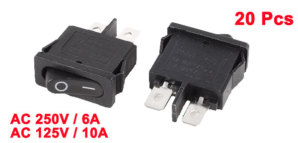 Product Name Rocker Switch Material Plastic Model KCD1 Contact Pin 2 Pin Switch Type SPST Voltage / Current AC 250V / 6A, AC 125V / 10A Size 20 x 9 x 25mm / 0.8" x 0.35" x 1"(L*W*H) Color Black Weight 50g Package Content 20 x Rocker Switches - Reviews