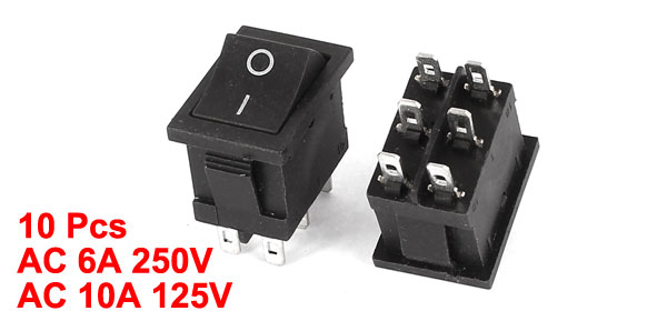 Product Name Rocker Switch Action DPDT Terminals 6 Pin (ON-OFF) Rating Voltage 6A 250VAC 10A 125VAC Total Size 2.1 x 1.5 x 2.5cm/0.83" x 0.59" x 1"(L* W *T) Mounting Dimension 2 x 1.2cm/0.8" x 0.47"(L*W) Color Black, Silver Tone Material Plastic & Metal Total Weight 49g Package Content 10 x Rocker Switch - Reviews