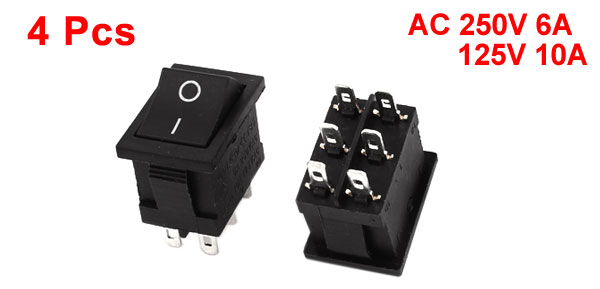 Pins 6 Main Color Black Product Name Rocker Switch Brand DMiotech Net Weight 21g Country of Manufacture CHINA Mounting Size 18 x 12mm/ 0.7" x 0.5"(L*W*) Package Content 4pcs x Rocker Switch Rating AC 250V 6A 125V 10A Material Plastic, Metal Contact Type DPDT, 2 Position (ON-OFF) Total Size 2.1 x 1.5 x 2.6cm / 0.8" x 0.6" x 1"(L* W *T)  - Reviews