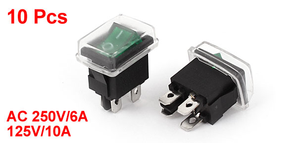 AC 250V/6A 125V/10A DPST ON/OFF 4 Pin Green Light Waterproof Rocker Switch 10PCS