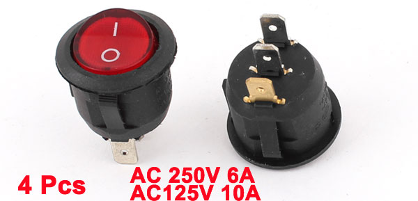 AC 250V 6A 125V 10A Red Lamp SPST ON-OFF 3pin Round Head Rocker Switch 4Pcs