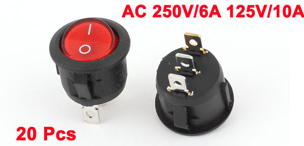 AC 250V/6A 125V/10A Red Light 3P SPST ON-OFF Round Rocker Switch KCD1 20 Pcs